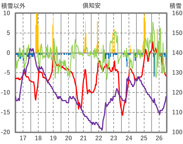 | 日 | 時 | 気温 | 降水 | 風向/風速 | 日照 | 積雪 | 降雪 |