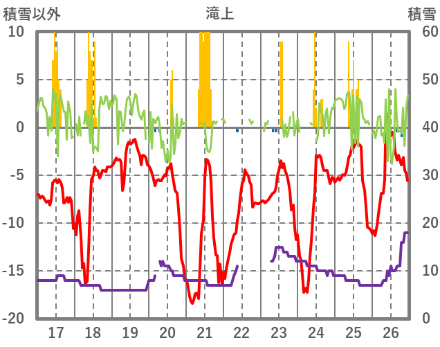 | 日 | 時 | 気温 | 降水 | 風向/風速 | 日照 | 積雪 | 降雪 |
