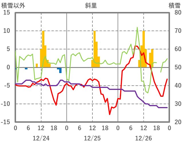 | 日 | 時 | 気温 | 降水 | 風向/風速 | 日照 | 積雪 | 降雪 |