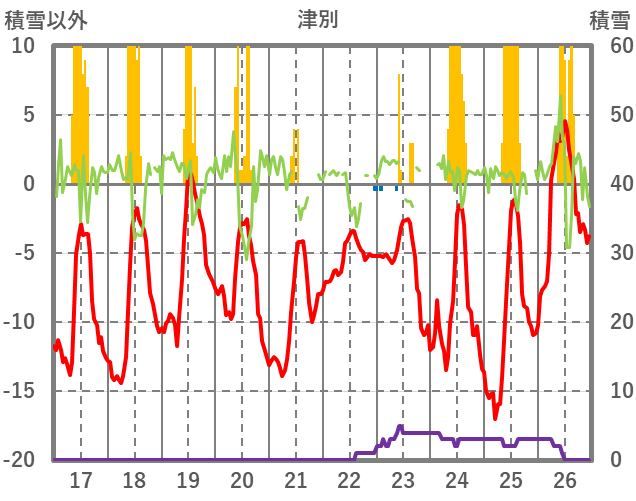 | 日 | 時 | 気温 | 降水 | 風向/風速 | 日照 | 積雪 | 降雪 |