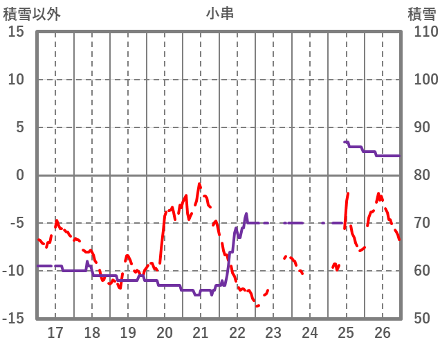 | 日 | 時 | 気温 | 降水 | 風向/風速 | 日照 | 積雪 | 降雪 |