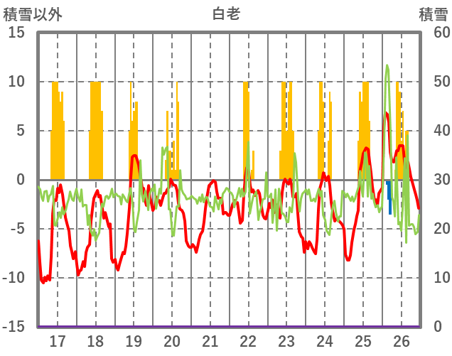 | 日 | 時 | 気温 | 降水 | 風向/風速 | 日照 | 積雪 | 降雪 |