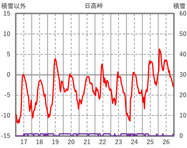 | 日 | 時 | 気温 | 降水 | 風向/風速 | 日照 | 積雪 | 降雪 |