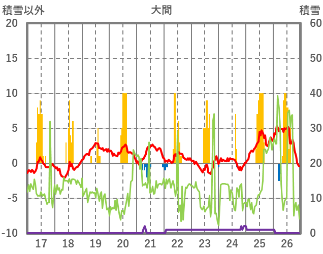 | 日 | 時 | 気温 | 降水 | 風向/風速 | 日照 | 積雪 | 降雪 |