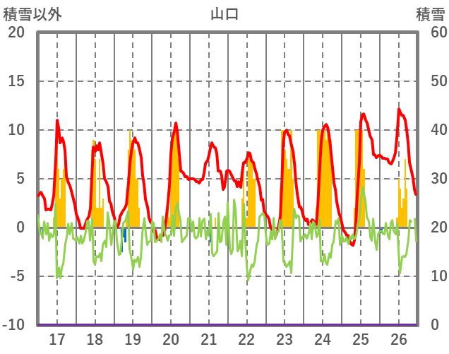 | 日 | 時 | 気温 | 降水 | 風向/風速 | 日照 | 積雪 | 降雪 |