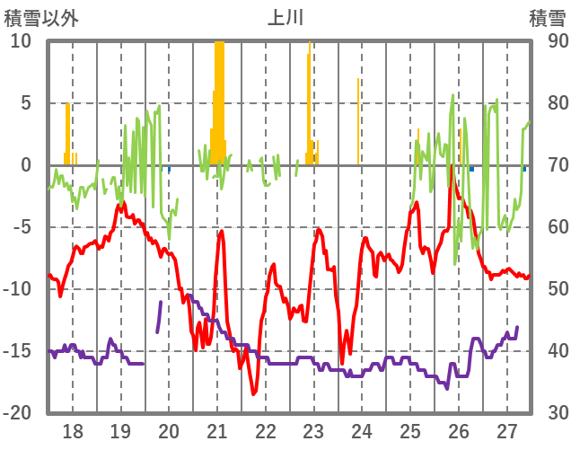 | 日 | 時 | 気温 | 降水 | 風向/風速 | 日照 | 積雪 | 降雪 |
