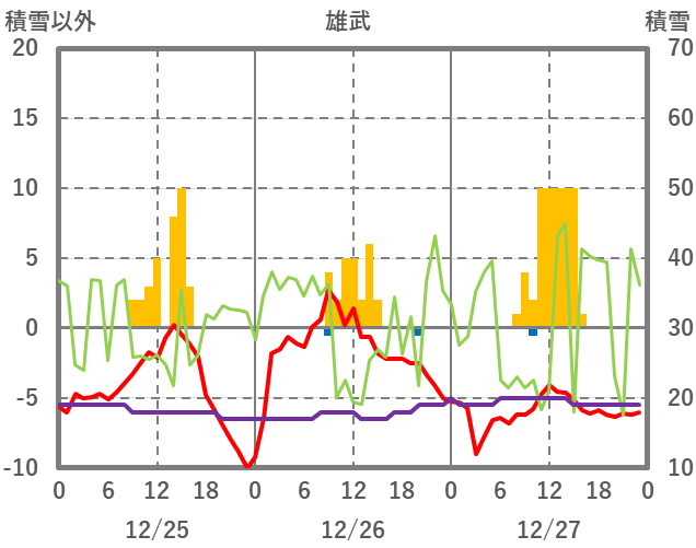 | 日 | 時 | 気温 | 降水 | 風向/風速 | 日照 | 積雪 | 降雪 |