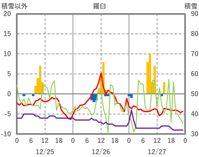 | 日 | 時 | 気温 | 降水 | 風向/風速 | 日照 | 積雪 | 降雪 |