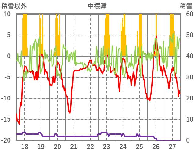 | 日 | 時 | 気温 | 降水 | 風向/風速 | 日照 | 積雪 | 降雪 |