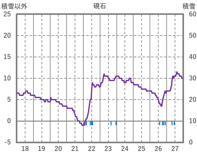 | 日 | 時 | 気温 | 降水 | 風向/風速 | 日照 | 積雪 | 降雪 |