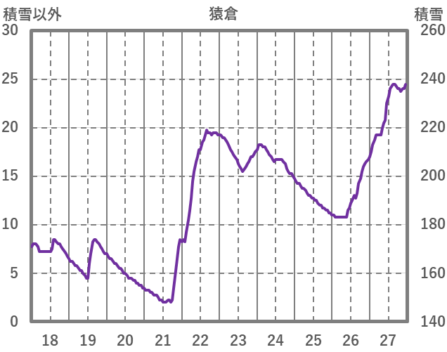 | 日 | 時 | 気温 | 降水 | 風向/風速 | 日照 | 積雪 | 降雪 |