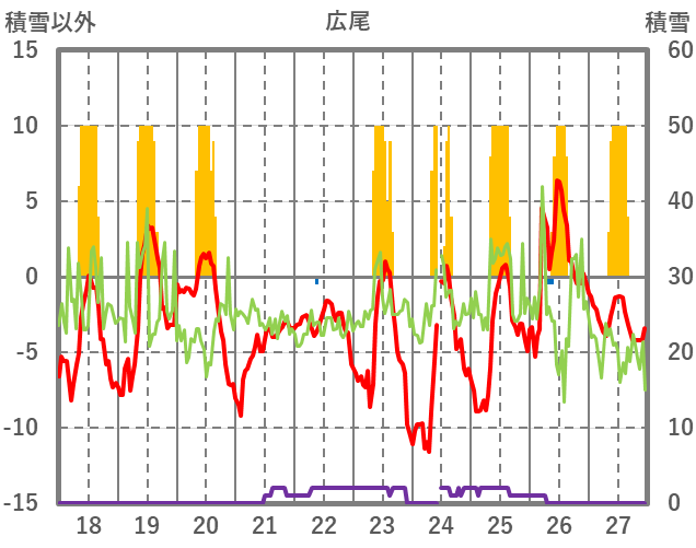 | 日 | 時 | 気温 | 降水 | 風向/風速 | 日照 | 積雪 | 降雪 |