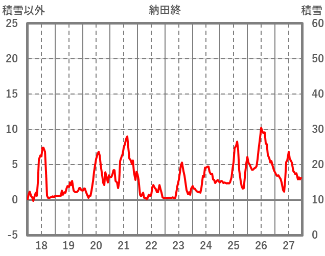 | 日 | 時 | 気温 | 降水 | 風向/風速 | 日照 | 積雪 | 降雪 |
