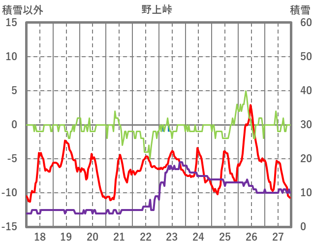 | 日 | 時 | 気温 | 降水 | 風向/風速 | 日照 | 積雪 | 降雪 |