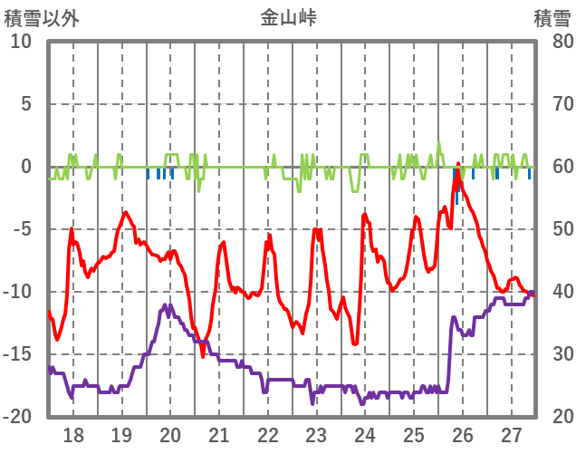 | 日 | 時 | 気温 | 降水 | 風向/風速 | 日照 | 積雪 | 降雪 |