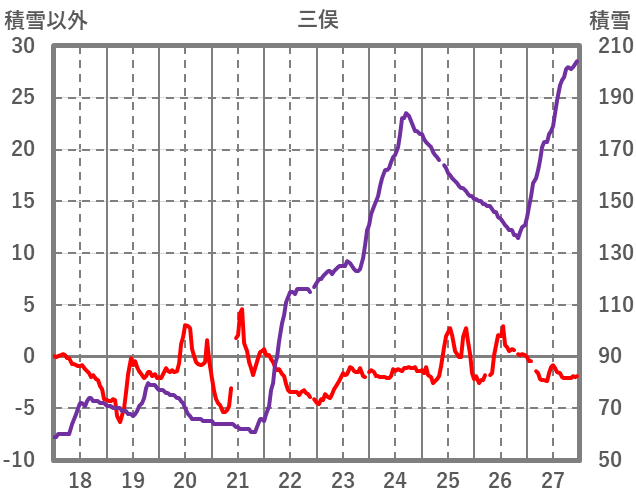| 日 | 時 | 気温 | 降水 | 風向/風速 | 日照 | 積雪 | 降雪 |