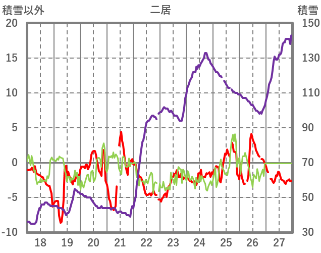 | 日 | 時 | 気温 | 降水 | 風向/風速 | 日照 | 積雪 | 降雪 |