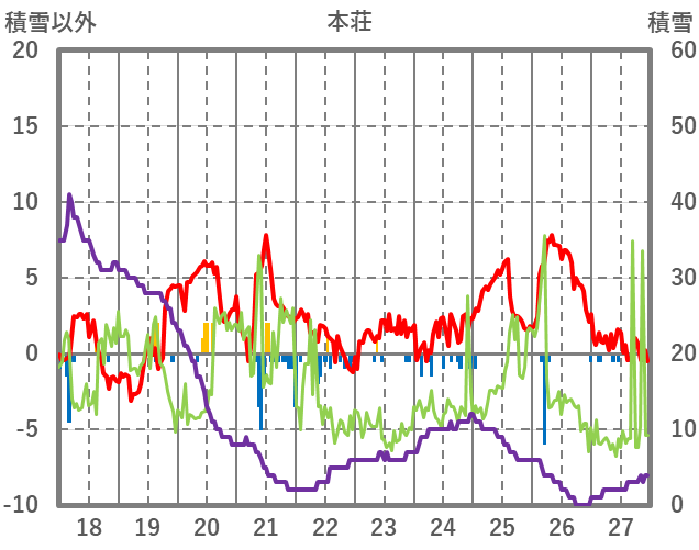 | 日 | 時 | 気温 | 降水 | 風向/風速 | 日照 | 積雪 | 降雪 |