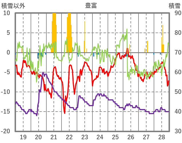 | 日 | 時 | 気温 | 降水 | 風向/風速 | 日照 | 積雪 | 降雪 |
