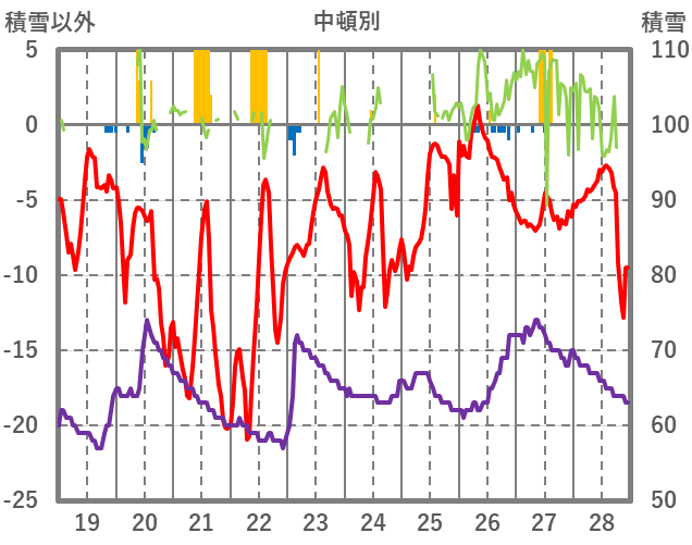 | 日 | 時 | 気温 | 降水 | 風向/風速 | 日照 | 積雪 | 降雪 |