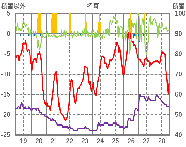 | 日 | 時 | 気温 | 降水 | 風向/風速 | 日照 | 積雪 | 降雪 |