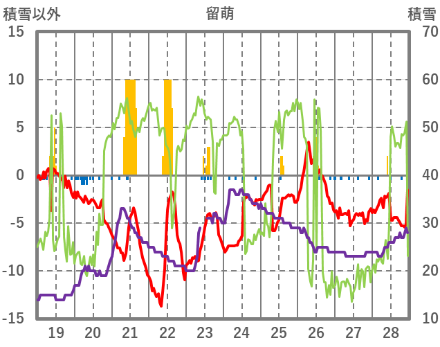 | 日 | 時 | 気温 | 降水 | 風向/風速 | 日照 | 積雪 | 降雪 |