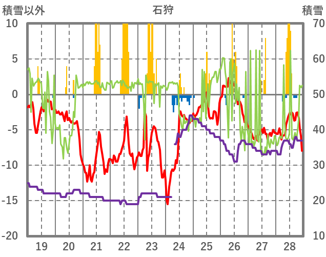 | 日 | 時 | 気温 | 降水 | 風向/風速 | 日照 | 積雪 | 降雪 |