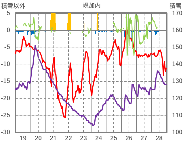 | 日 | 時 | 気温 | 降水 | 風向/風速 | 日照 | 積雪 | 降雪 |