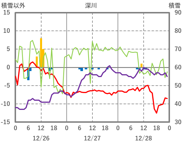 | 日 | 時 | 気温 | 降水 | 風向/風速 | 日照 | 積雪 | 降雪 |