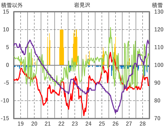 | 日 | 時 | 気温 | 降水 | 風向/風速 | 日照 | 積雪 | 降雪 |