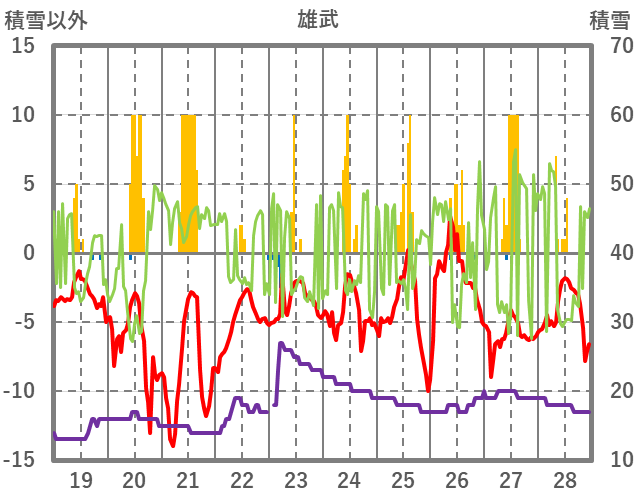 | 日 | 時 | 気温 | 降水 | 風向/風速 | 日照 | 積雪 | 降雪 |
