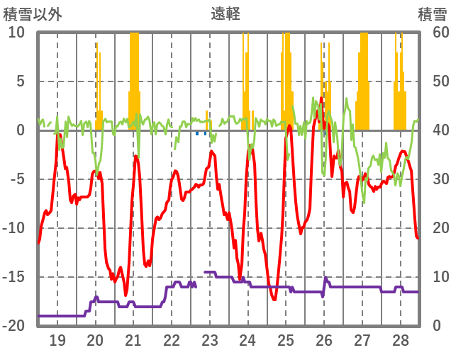 | 日 | 時 | 気温 | 降水 | 風向/風速 | 日照 | 積雪 | 降雪 |