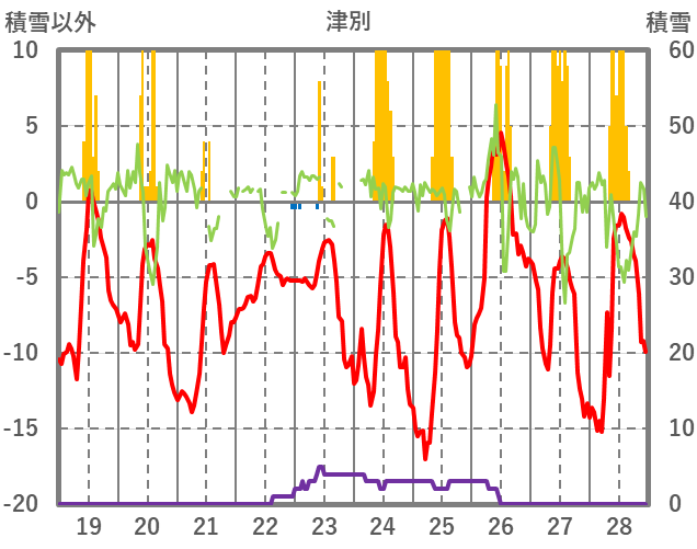 | 日 | 時 | 気温 | 降水 | 風向/風速 | 日照 | 積雪 | 降雪 |