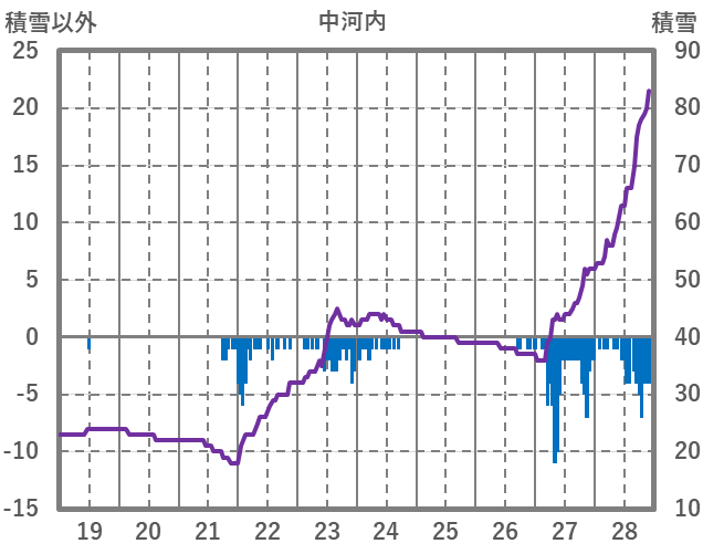 | 日 | 時 | 気温 | 降水 | 風向/風速 | 日照 | 積雪 | 降雪 |