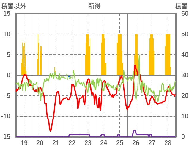 | 日 | 時 | 気温 | 降水 | 風向/風速 | 日照 | 積雪 | 降雪 |