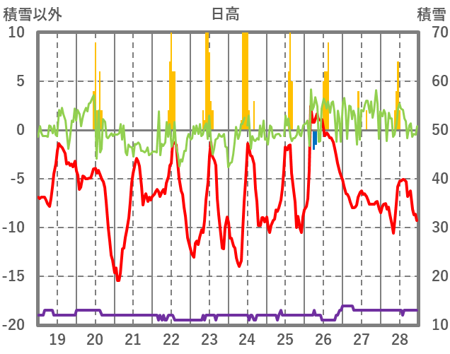 | 日 | 時 | 気温 | 降水 | 風向/風速 | 日照 | 積雪 | 降雪 |
