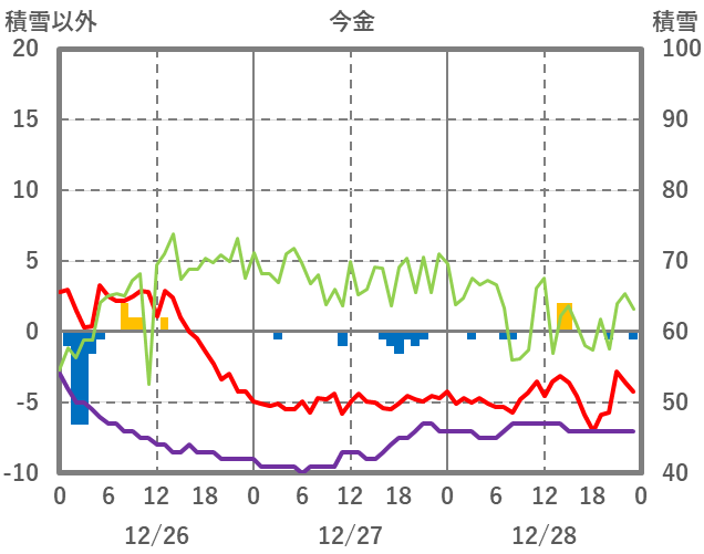 | 日 | 時 | 気温 | 降水 | 風向/風速 | 日照 | 積雪 | 降雪 |
