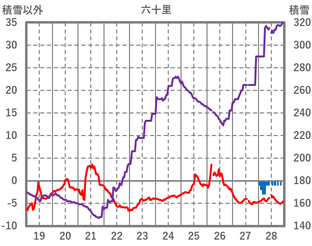 | 日 | 時 | 気温 | 降水 | 風向/風速 | 日照 | 積雪 | 降雪 |