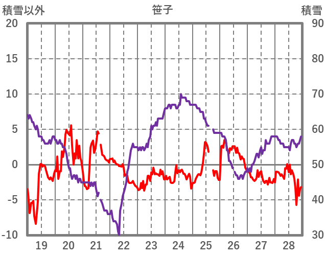 | 日 | 時 | 気温 | 降水 | 風向/風速 | 日照 | 積雪 | 降雪 |