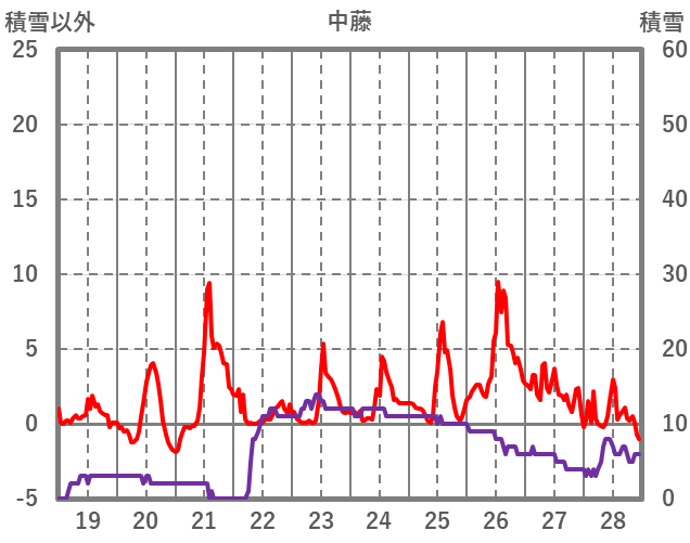 | 日 | 時 | 気温 | 降水 | 風向/風速 | 日照 | 積雪 | 降雪 |