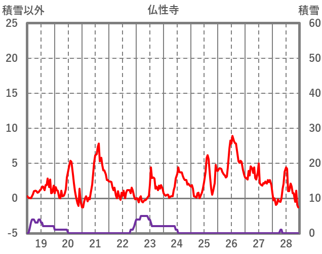 | 日 | 時 | 気温 | 降水 | 風向/風速 | 日照 | 積雪 | 降雪 |