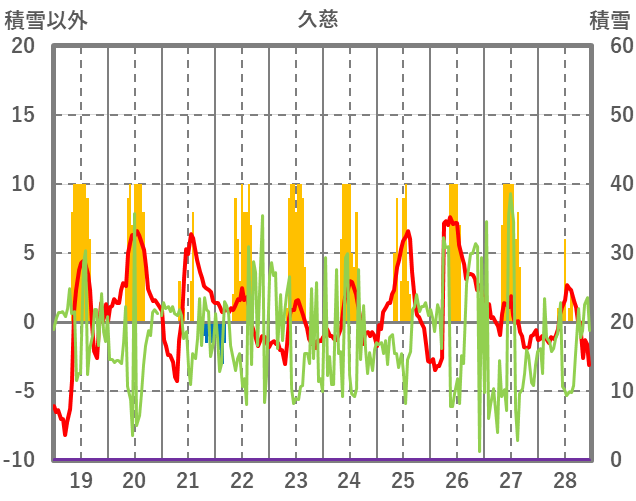 | 日 | 時 | 気温 | 降水 | 風向/風速 | 日照 | 積雪 | 降雪 |