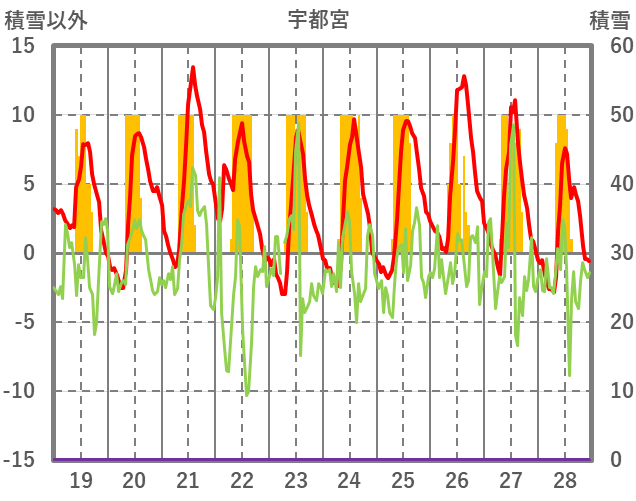 | 日 | 時 | 気温 | 降水 | 風向/風速 | 日照 | 積雪 | 降雪 |