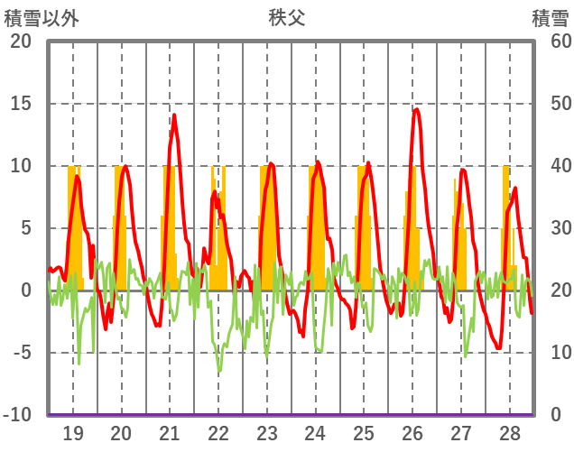 | 日 | 時 | 気温 | 降水 | 風向/風速 | 日照 | 積雪 | 降雪 |