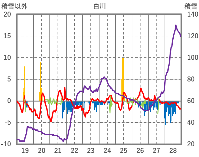 | 日 | 時 | 気温 | 降水 | 風向/風速 | 日照 | 積雪 | 降雪 |