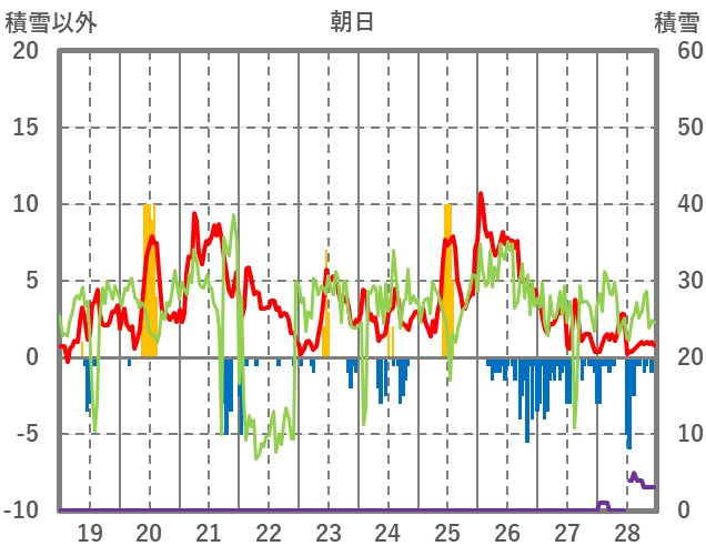 | 日 | 時 | 気温 | 降水 | 風向/風速 | 日照 | 積雪 | 降雪 |