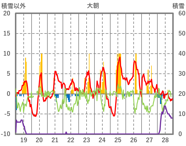 | 日 | 時 | 気温 | 降水 | 風向/風速 | 日照 | 積雪 | 降雪 |