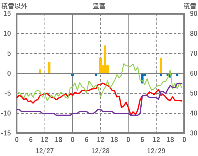 | 日 | 時 | 気温 | 降水 | 風向/風速 | 日照 | 積雪 | 降雪 |
