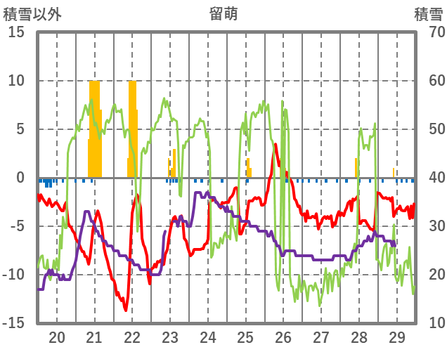 | 日 | 時 | 気温 | 降水 | 風向/風速 | 日照 | 積雪 | 降雪 |