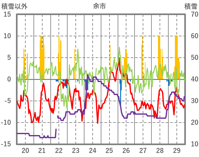 | 日 | 時 | 気温 | 降水 | 風向/風速 | 日照 | 積雪 | 降雪 |